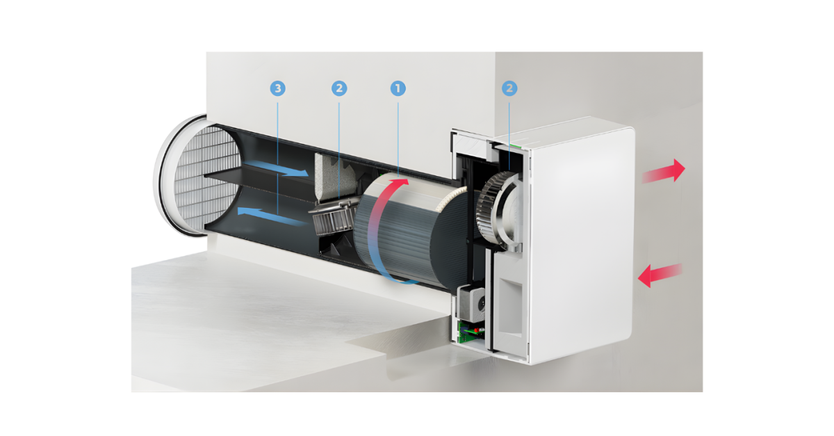 Das ultra-kompakte Design des miniaturisierten rotierenden Wärmetauschers (1) ermöglicht erstmals in einem kompakten Gehäuse die regenerative Wärmerückgewinnung. Zwei druckfeste Ventilatoren (2) gewährleisten die Balance von Zu- und Abluft (3) auch bei hohem Winddruck an der Fassade, ohne Leistungsverlust. Darüber hinaus kann der jeweilige Ventilator deaktiviert werden, sodass das System im reinen Zuluft- oder Abluftmodus betrieben werden kann – zum Beispiel für die intelligente Badsteuerung. Das vorübergehende Deaktivieren der Wärmerückgewinnungsfunktion erlaubt zudem die Nutzung passiver Kühlung im Sommer.